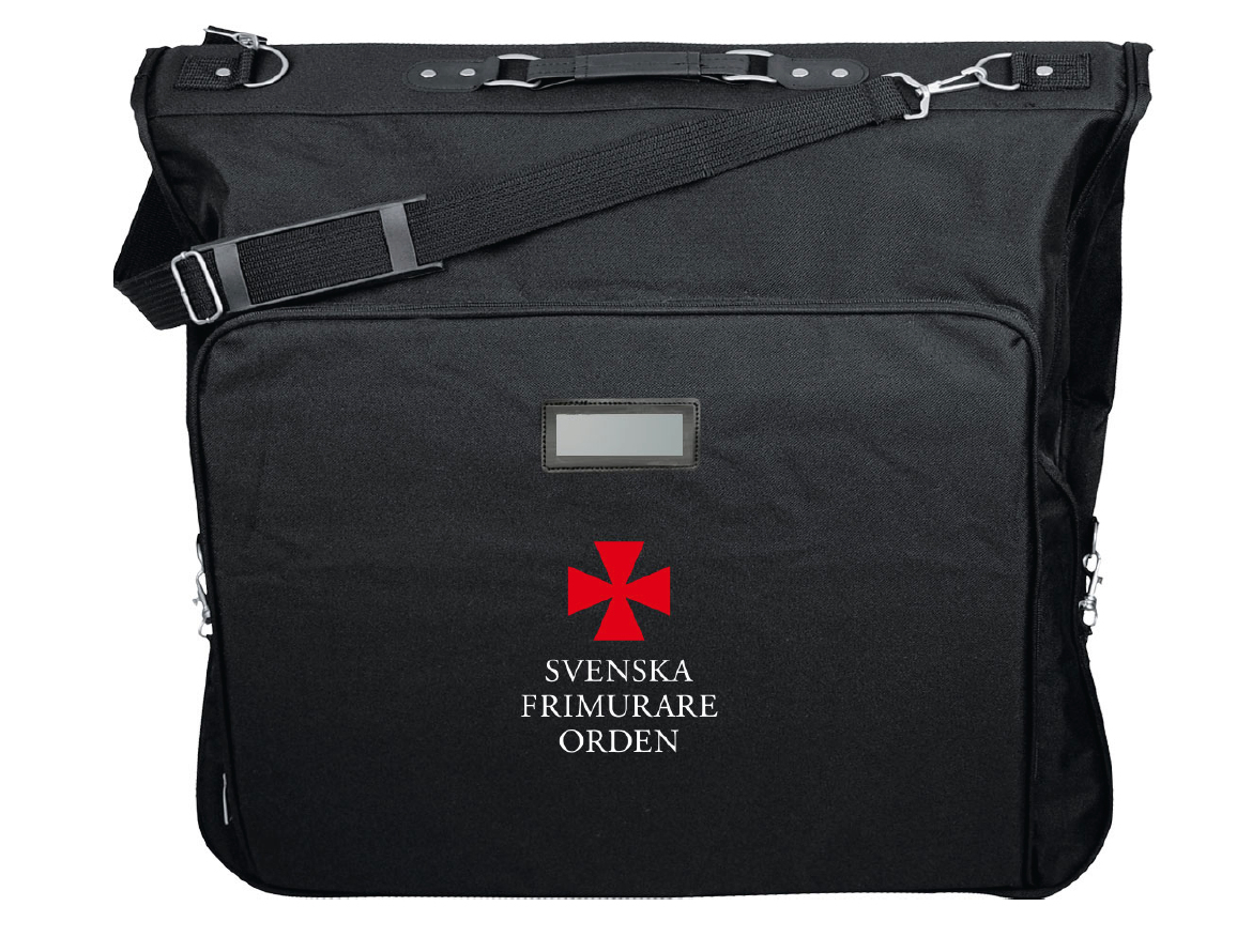 Storlek 110×60 cm, en resegarderob i slitstark polyester med axelrem, handtag, samt extra förvaringsfack för förvaring av till exempel skor. Rymlig ficka på utsidan för övriga artiklar. Tryck med Svenska Frimurare Orden och vårt röda kors. Passar utmärkt för logebesöket över en eller två dagar.